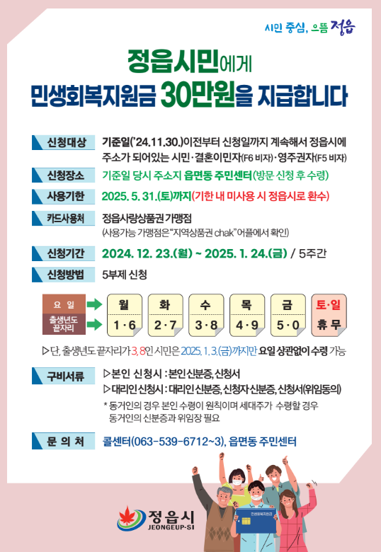 - 2024년 11월 30일 이전부터 신청일까지 계속하여 정읍시에 주민등록이 되어 있는 시민